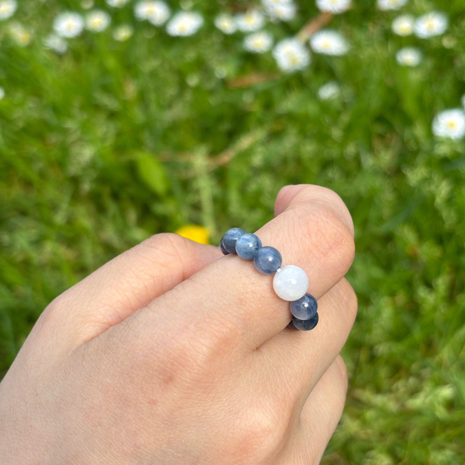 White Moonstone — Intuition & Light: A single luminous bead at the heart of the ring, radiating feminine energy, emotional harmony, and quiet guidance.